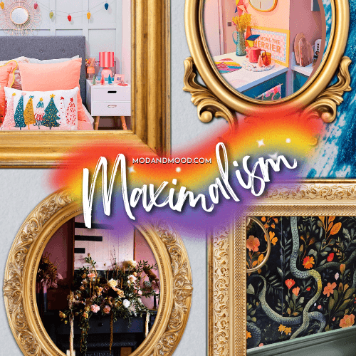 Graphic reads "Maximalism" over a rainbow above 4 gold framed photos of maximalist spaces